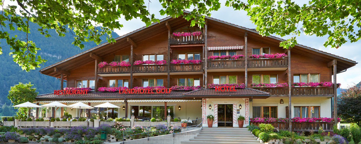 Das Hotel im Schweizer Chaletstil liegt mitten im Grünen, nur 300 m vom Thunersee entfernt. Hier geniesst der Gast den freien Blick auf die imposante Bergkulisse des Berner Oberlandes. Bei der herzlichen Gastgeberfamilie Salzano ist man bestens aufgehoben. Das Landhotel Golf ist bekannt für seine exzellente, typisch Schweizerische, italienische und internationale Küche. Das Restaurant hat eine Apéro-Bar und eine grosse Sonnenterrasse. Die 30 Zimmer, Suiten und Romantik-Zimmer sind individuell und geschmackvoll eingerichtet. Zum Hotel gehört ein Garten mit Gäste-Liegewiese. Der neue Salzano SPA ist eine Erlebniswelt für Körper und Seele. Die Wellness-Anlage bietet naturnahe und nicht alltägliche alpine Wellness-Einrichtungen sowie Massagen und Beauty-Anwendungen. Im Spa sind auch externe Gäste willkommen. Interlaken ist der ideale Ausgangspunkt für Entdeckungstouren im Berner Oberland.