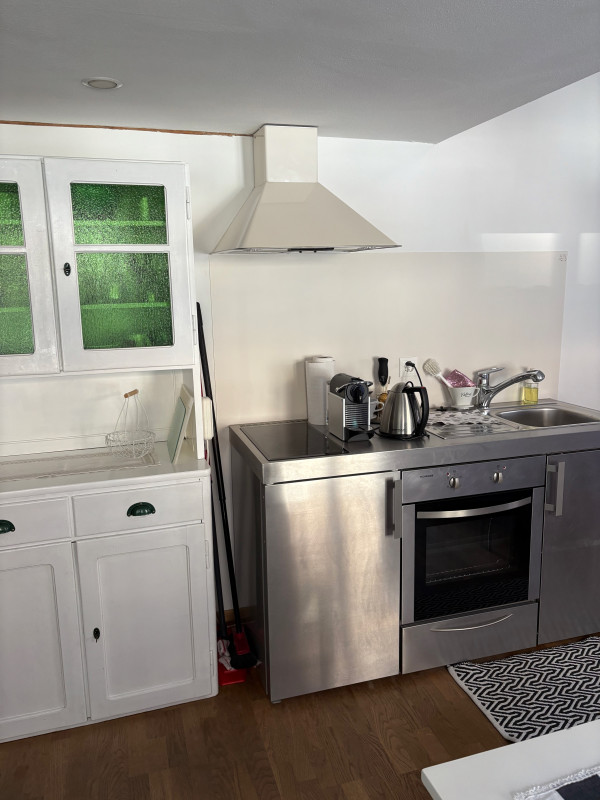 Studio mit 2 Betten; kleine Küche mit Kühlschrank und Nespresso Maschine; Dusche & WC