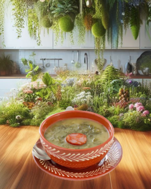 Caldo Verde, zubereitet mit einer Brühe aus Zwiebeln, Knoblauch und zerkleinerten Kartoffeln, zu der in sehr dünnen Streifen geschnittener Grünkohl hinzugefügt wird. Dann mit etwas Olivenöl beträufeln und aufkochen lassen.