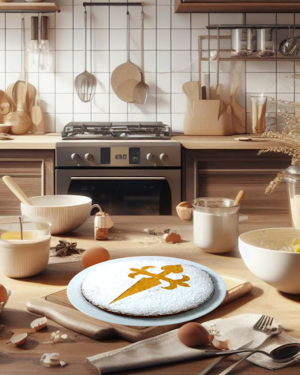 Die Schablone des Kreuzes von Santiago de Compostela auf den ausgekühlten Kuchen legen und mit Puderzucker bestreuen. Schablone anschliessend vorsichtig entfernen.