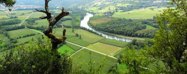 In Jongieux starten wir schon fast auf dem Kulminationspunkt der ersten von 2 Höhen, die wir heute in einer physisch anspruchsvollen Etappe überwinden werden. Bei Jongieux-Le-Haut können wir im Süden den «Dent du Chat» bewundern. Als nächstes kommen wir an der Kapelle St. Romain vorbei, bevor wir auf einem Fussweg in Serpentinen steil zur Rhône hinuntersteigen. Jetzt folgt dieser erwähnte Abschnitt direkt am Ufer der Rhône bis Yenne, einem Ort wo wir nochmals unsere Vorräte ergänzen können. In Yenne ist vor allem die Église Notre Dame de l´Assomption (12. Jh) besuchenswert. Ab hier hat sich die Rhône einen engen Durchbruch mit steilen Flanken in die Berge geschnitten. wir bleiben einmal mehr nicht in der Talsohle, sondern gehen in die Höhen, bis zum Etappenort erwartet uns deshalb nun vorwiegend Natur pur. In einem kontinuierlichen Aufstieg steigen wir durch bewaldete Bergflanken bis auf 849 müM, zum Teil wieder mit Blick auf die Rhône, bevor dann der Abstieg nach Saint-Genix beginnt, einem Ort am Ufer des Guiers kurz vor dessen Mündung in die Rhône.