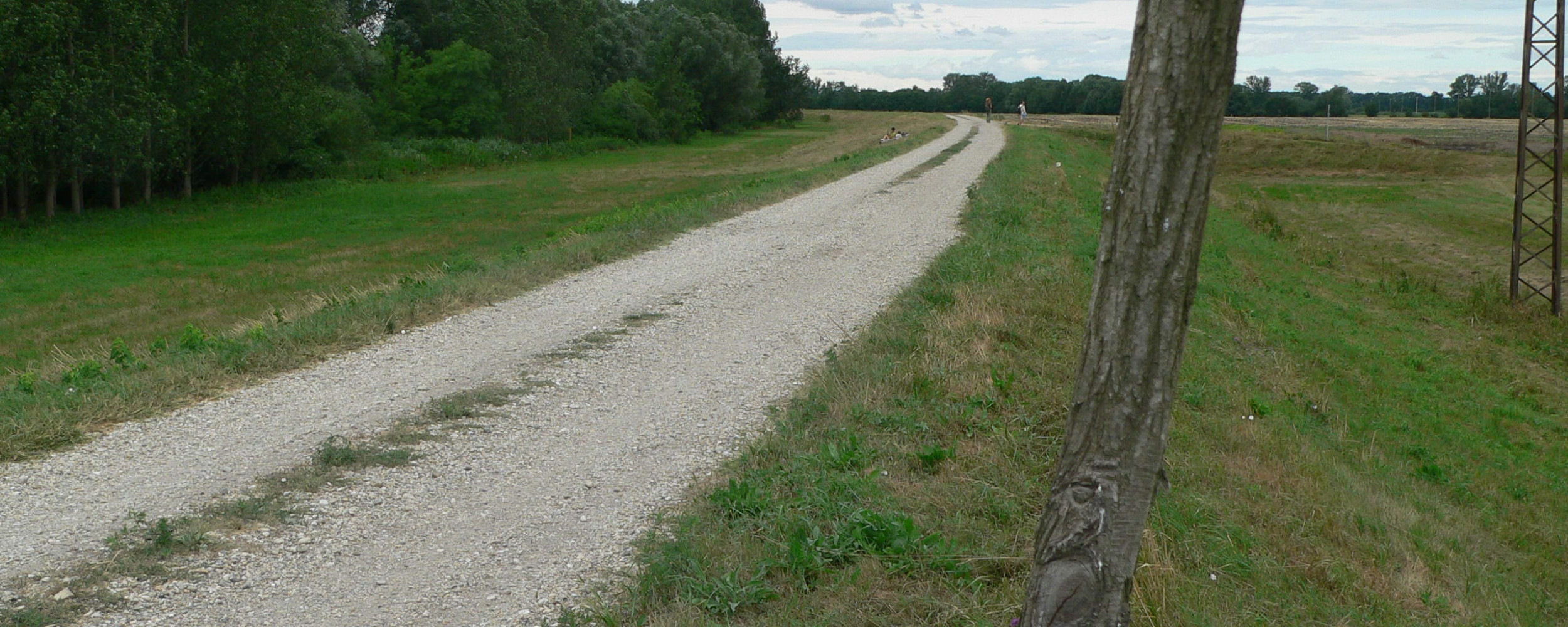 Nach dieser kleinen Lichtung kommen wir auf einen guten Weg, aber so gut wie ohne Schatten, auf den Damm des Flusses Rába. Wir gehen über die Autostrasse Nr.1 und später unter Bahngleisen und der Autobahn M1. Wenn wir die Abzweigung Börcs-Ikrény erreicht haben, gehen wir über eine Brücke und gehen jetzt weiter auf dem Damm des Flusses Rába auf der anderen Seite.