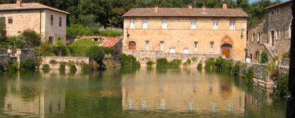 Schon kurz nach dem Start erreichen wir auf einer ersten Höhe das sympathische Bergdorf Vignoni Alto, von dem der Weg dann wieder hinunterführt ins Tal des Fiume Orcia. Dort unten treffen wir auf eine echte Rarität: der Kurort Bagno Vignoni hat, wie der Name vermuten lässt, viel mit «Baden» zu tun, den er verfügt über eine Thermalquelle. Gebadet wird allerdings nicht in einem Kurhaus, und auch nicht in einem modernen Bassin, sondern in einem antiken Wasserbecken, das anstelle der sonst normalen Piazza mitten im Ort liegt.