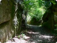 Beside the wood-bridge, a concrete bridge was built in 1979. Here we cross the cantonal border and after a short stretch, we turn off to a hollow road leading upwards. On the sandstone walls at the side of the path, inscriptions are visible. After the steep ascent we reach even ground and come to a wayside shrine dedicated to St. James. From here, a small road leads us to the village edge of Heitenried.