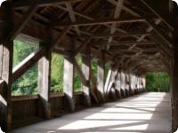 The covered wooden bridge from 1835 was only transplanted to this site in 1973 when the motorway was built. Walking along the wooded shore-strip, we come in a north-western direction to the Giessehof. Shortly after, the path turns off to the left and comes to the bridge across the Gürbe river, north of the airfield of Belp. We cross the bridge in order to come over the plain of Belp to “Under-Selhofe” a part of the town of Belp. From here southwards through the town-part Ober-Selhofe past the schoolhouse and the modern church of the ecumenical centre to Kehrsatz.