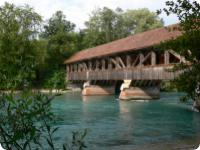 At the edge of the Hüenliwald (wood), we turn off to the right onto a forest road that takes us in a south-western direction through the wood, crossing the main road, and to the motorway which we cross too. After the motorway, we pass the park of a castle compound on its right-hand side, and, forming a wide bend, we come through Halen, a part of the town of Muri, and come down to the river Aare which we cross on the Auguet bridge.