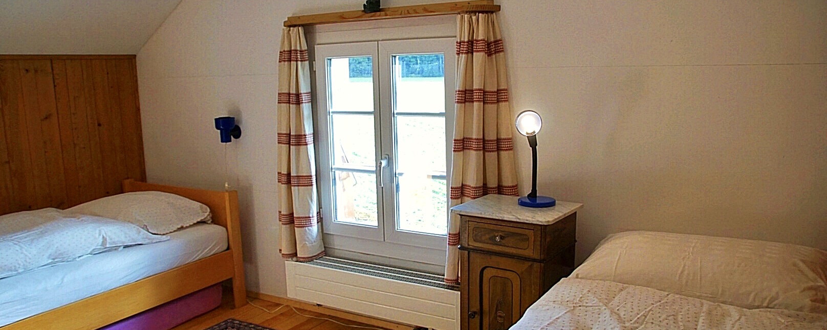2 heimelige Mansardenzimmer im 2.Stock, geräumige Etagendusche mit WC.