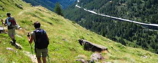 Nous ne devons pas cheminer sur la route asphaltée du col, mais pouvons par contre emprunter un chemin alpin qui nous mènera rapidement en bas du col. Lors de la descente, demandant moins d´effort que l´ascension du jour précédent, nous pouvons admirer, détendu, comme la nature se change rapidement de la flore alpine. La verdure et les premiers buissons sont l´annonce des premiers arbres que nous allons rencontrer. St-Rhémy est le premier village que nous apercevons, situé à 1620m d´altitude, puis suivent d´autres localités qui peuvent également servir de lieux pour passer la nuit. Via Saint-Oyen, nous arrivons à Etroubles, lieu de séjour très prisé. Ici se trouve la ferme «Château Verdun» qui, jadis, livrait la nourriture à l´hospice du Grand-Saint-Bernard. Aujourd´hui, cette ferme est un logis pour pèlerins.
