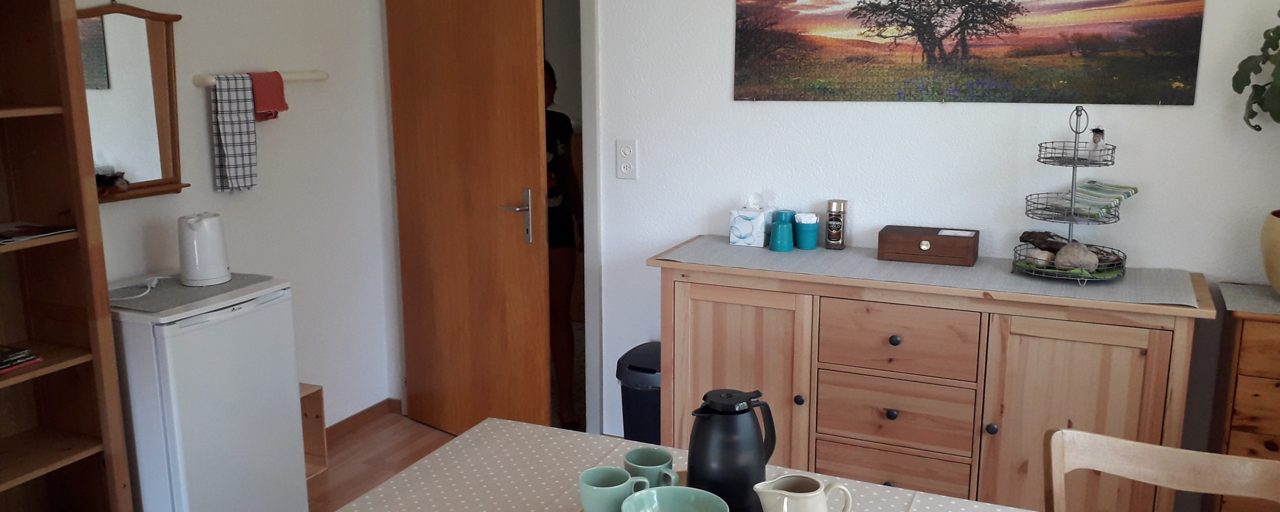 Ausgestattet mit Kühlschrank und Wasserkocher.