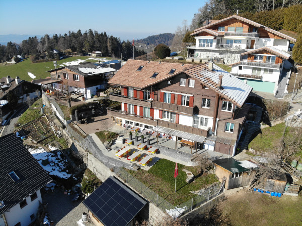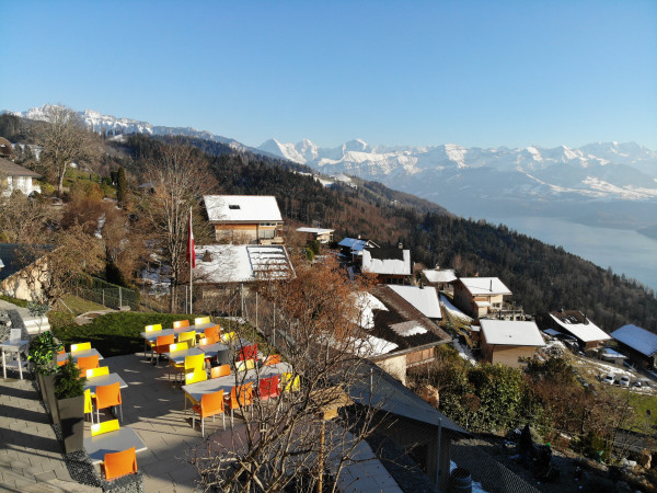 Etwas abgelegen von der Hauptstrasse, oberhalb von Thun, in einem ruhigen Wohnquartier mit Weitsicht auf die Berner Alpen und den Thunersee. Die nächste öffenliche Bushaltestelle ist "Heiligenschwendi, Dörfli". Von da sind es 20 Minuten zu Fuss bis zur Sonnegg.