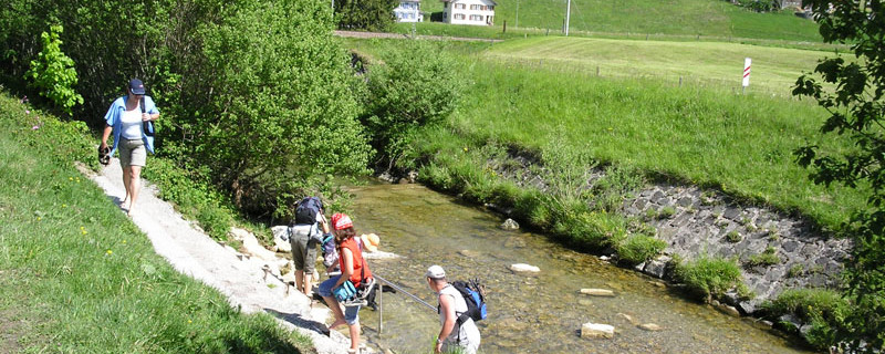 L’eau de la source de St-Jacques, qui prend sa naissance juste en-dessous du sommet, était connue pour son pouvoir curatif, le chemin que nous empruntons est bien signalisé et agréable à marcher il est souvent parcouru à pieds nus. Le restaurant "Skilift", se trouvant entre Gonten et Jakobsbad, est ouvert toute l’année. Tout près de la place de camping nous passons à côté de la petite chapelle Ste-Anne, qui date de 1771 et qui a été rénovée en 2002. Juste avant Jakobsbad, nous franchissons le Wissbach où nous pouvons tremper nos pieds dans l’eau bienfaisante de la rivière, près du pont une barre a été fixée pour nous aider.