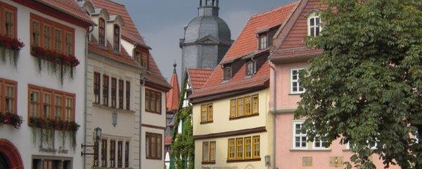 Der ökumenische Pilgerweg hält sich innerhalb des Stadtgebietes fast authentisch an den alten Strassenverlauf. Wir folgen der Muschel durch die Weimarer Straße, die zur Erfurter Landstraße wird, wenden uns nach rechts, und gehen am Bächlein entlang bis zum Busbahnhof. Dort überqueren wir ihn und gehen den Mohrenberg hinauf zur Huttenstraße. Von dort gelangen wir in die Erfurter Straße, die zum Marktplatz führt und daran vorbei zum Brühl. An der großen Kreuzung orientieren wir uns zur Eisenacher Straße und gehen auf ihr westwärts bis nach etwa einem Kilometer der Berggartenweg nach rechts abbiegt. Von diesem wenden wir uns bald wieder nach links und pilgern durch Siedlungen aus der Stadt hinaus. Bald erreichen wir den Kriegberg, einen ehemaligen Truppenübungsplatz.