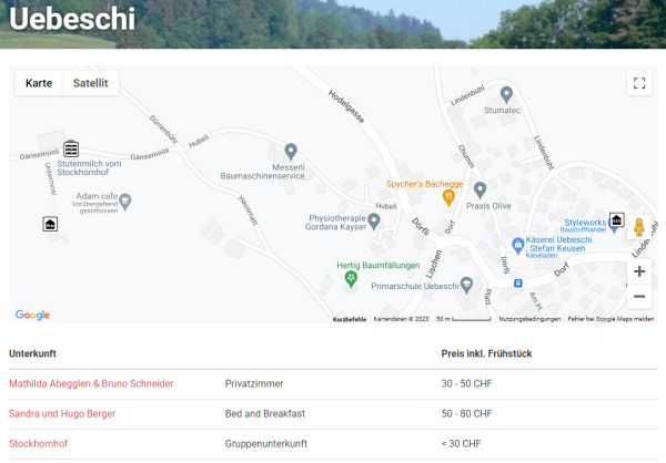 Eine interaktive Karte mit den passenden Symbolen und eine Liste zeigen, was in der betreffenden Ortschaft angeboten wird.
